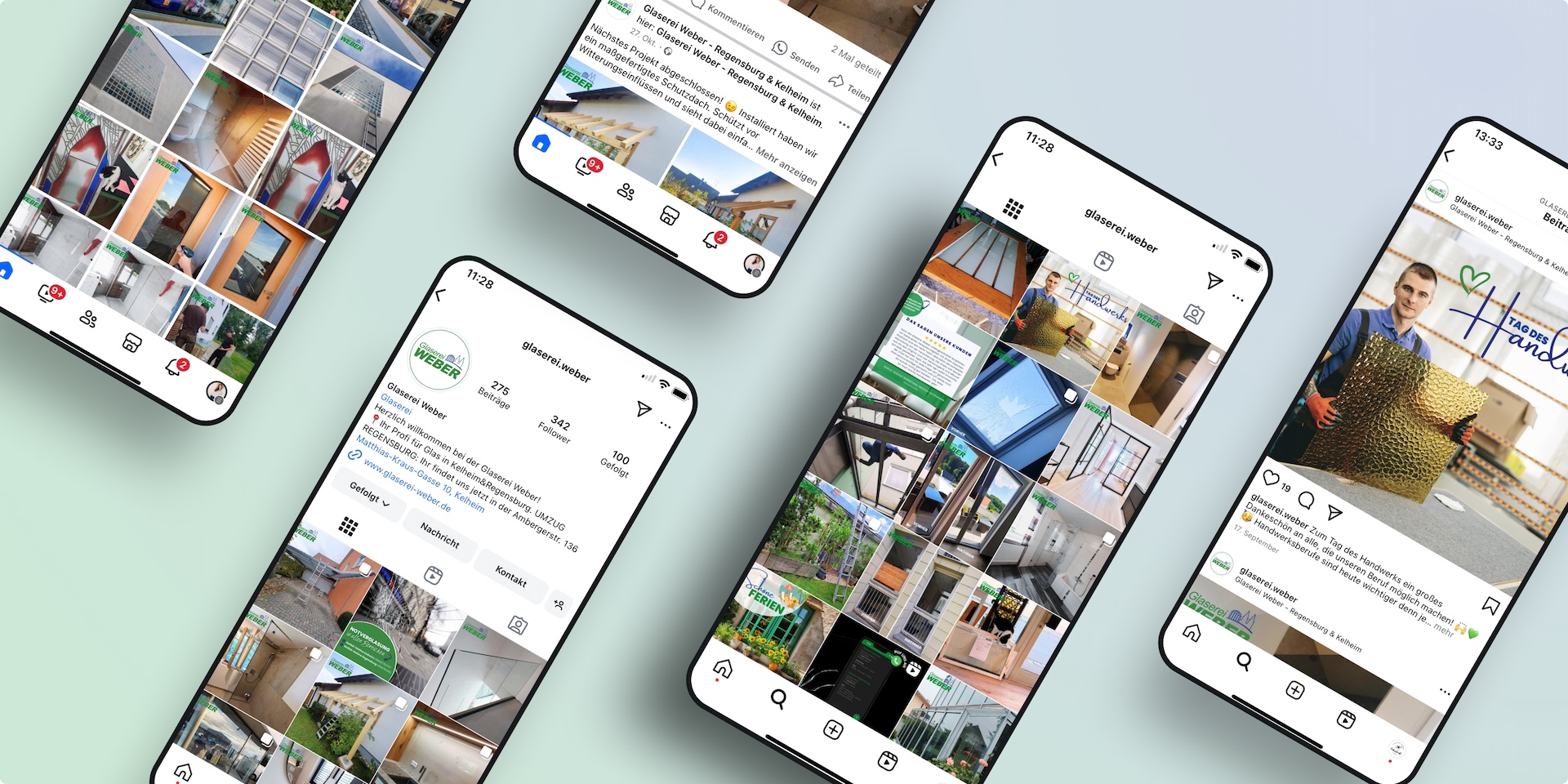 Innerhalb kurzer Zeit etablierte sich die Glaserei Weber auf Facebook und Instagram als professionelle Anlaufstelle für Glasarbeiten. Die Kanäle generieren regelmäßig regionale Aufmerksamkeit und haben bereits zu ersten Kundenanfragen geführt – ein gelungener Start in die Welt der sozialen Medien.